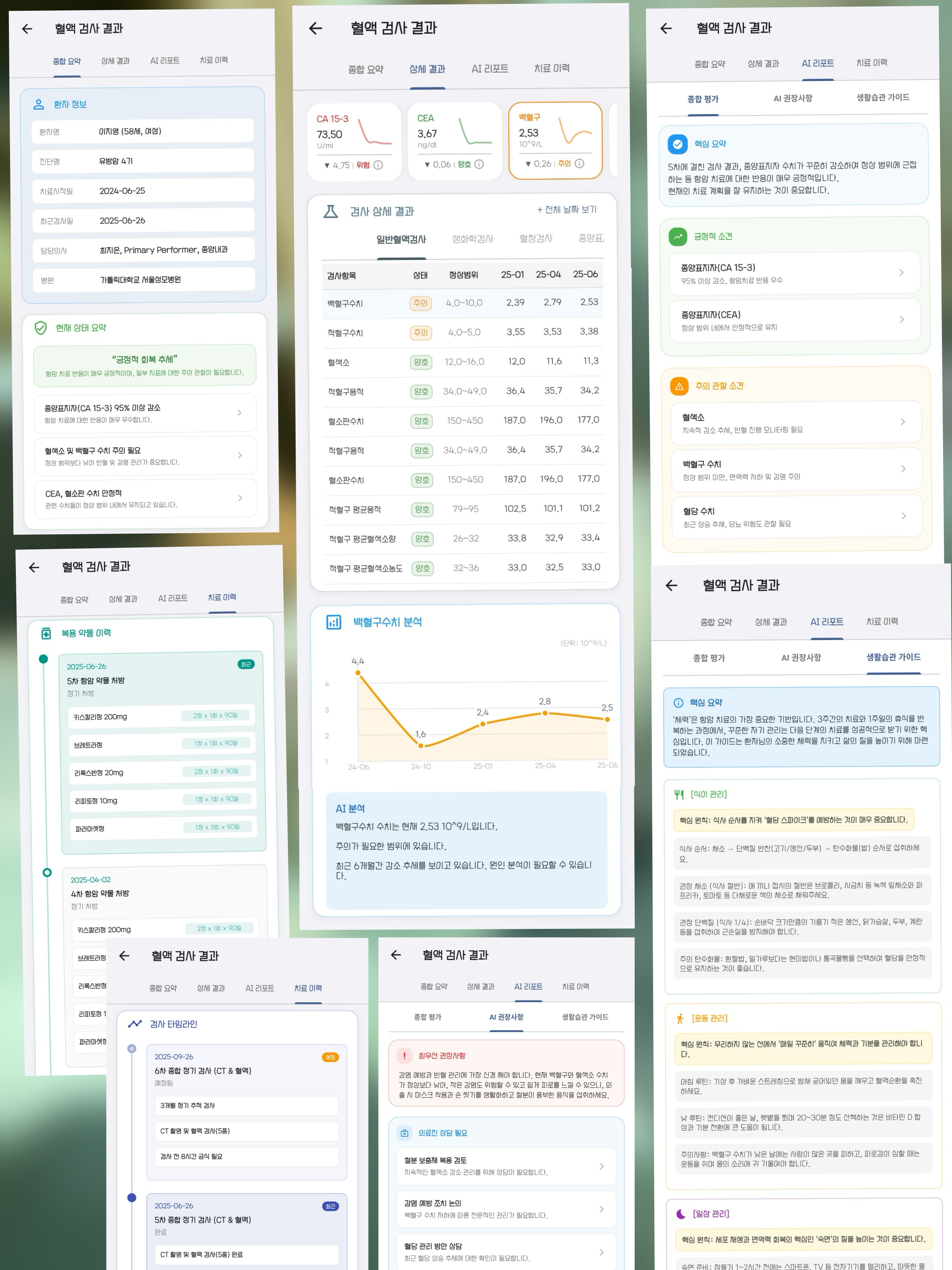 주요 혈액 검사 항목의 추이를 Agent Ops Platform이 분석하여 정상, 주의, 위험 상태를 판단하고, AI 기반의 개인 맞춤형 소견을 제공합니다.