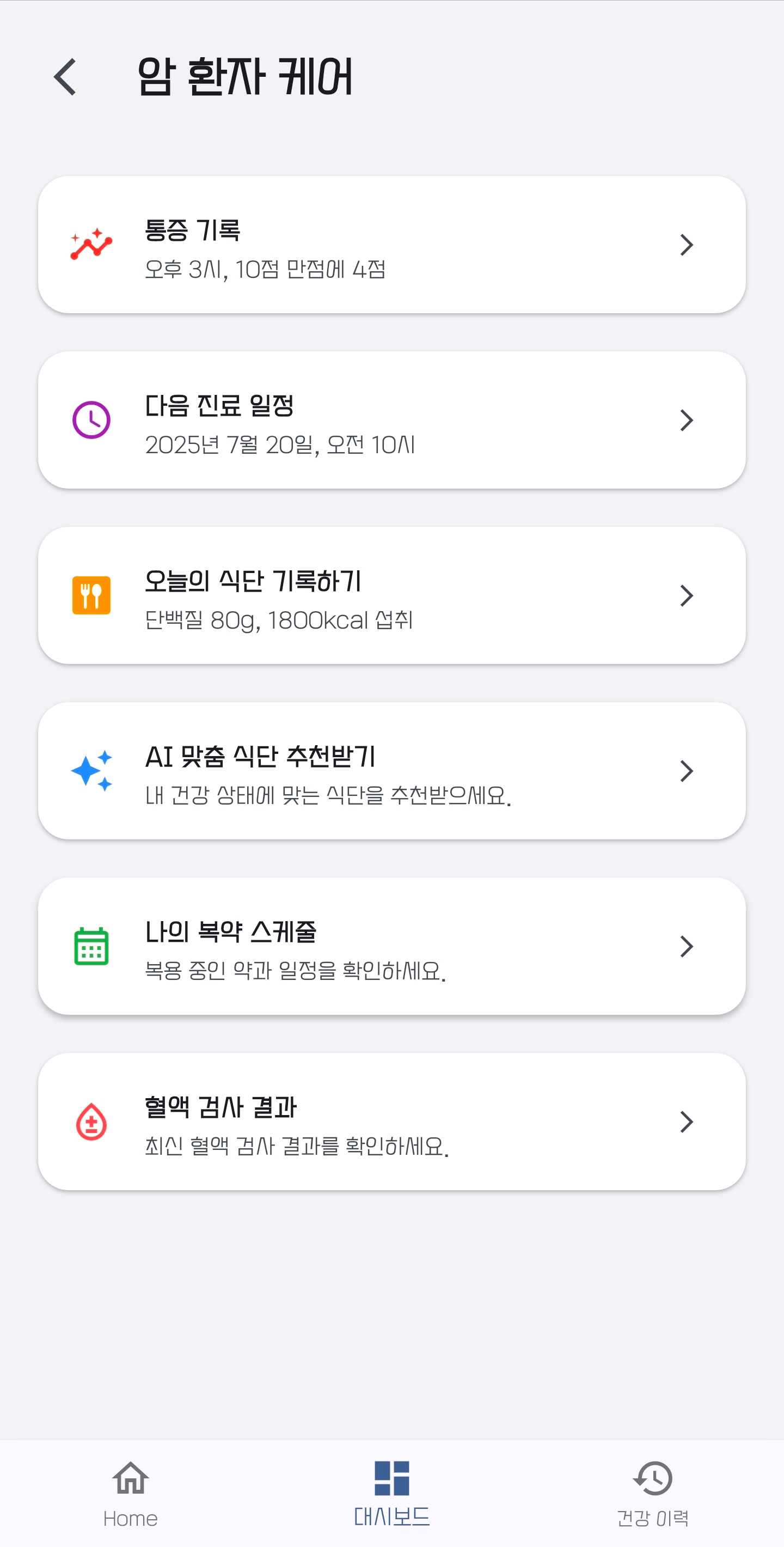 통증, 식단, 복약, 진료 일정 등 암 환자의 치료 전 과정을 체계적으로 관리하는 모바일 솔루션입니다.