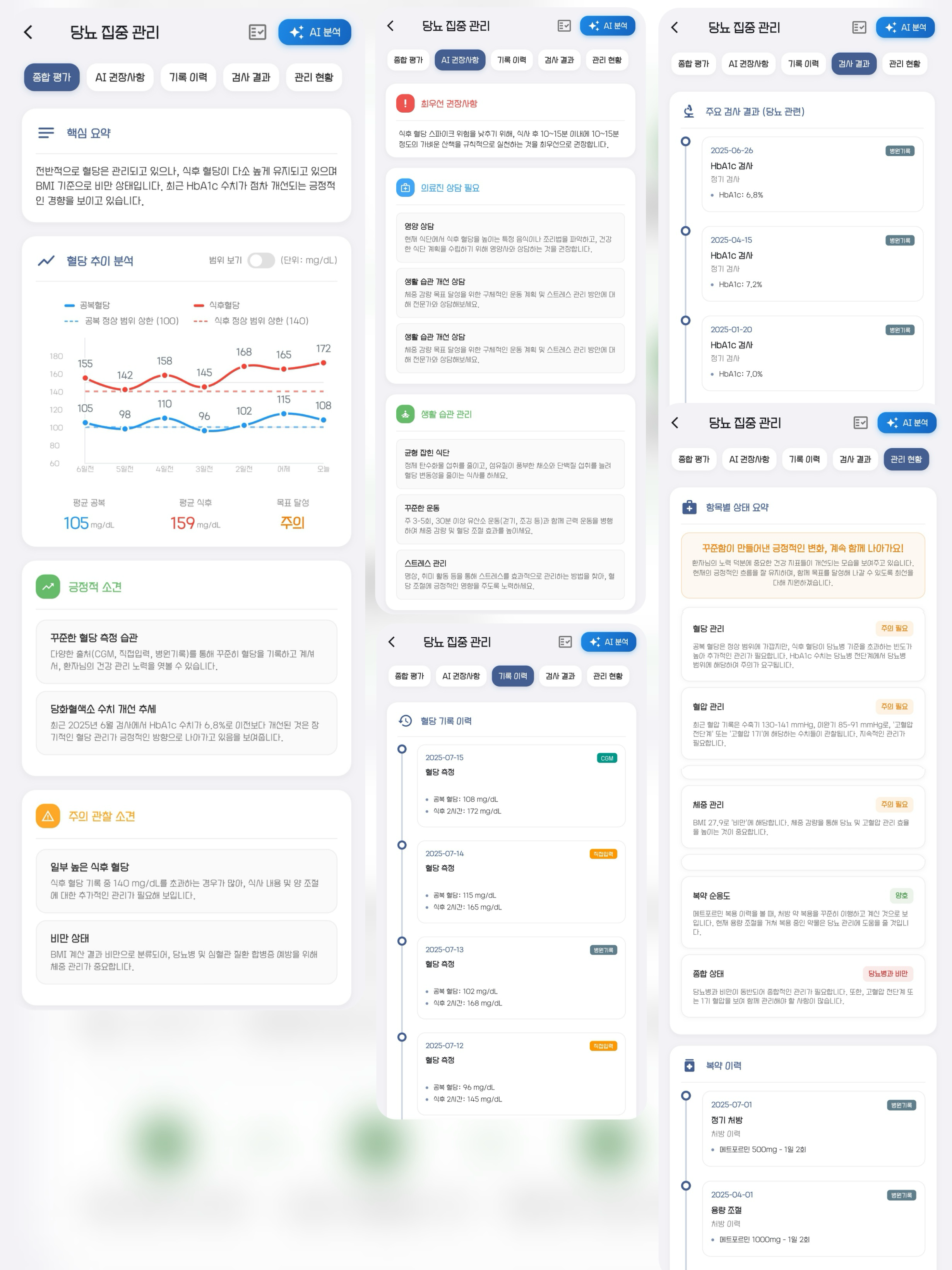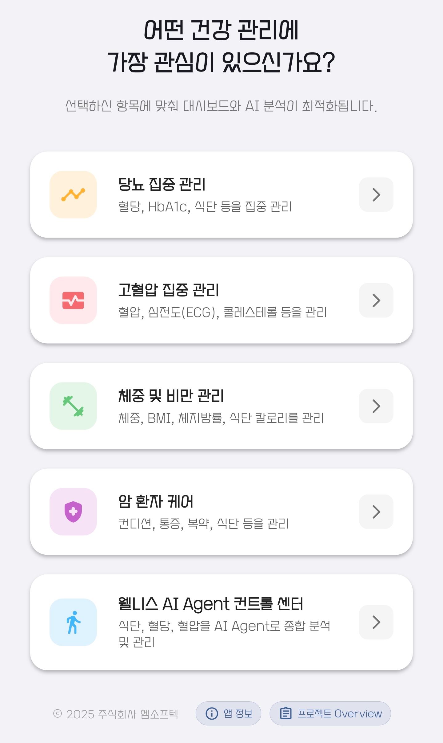 당뇨, 고혈압, 암 등 5가지 건강 관리 모드를 제공하여 사용자에게 최적화된 대시보드와 AI 분석을 제공합니다.